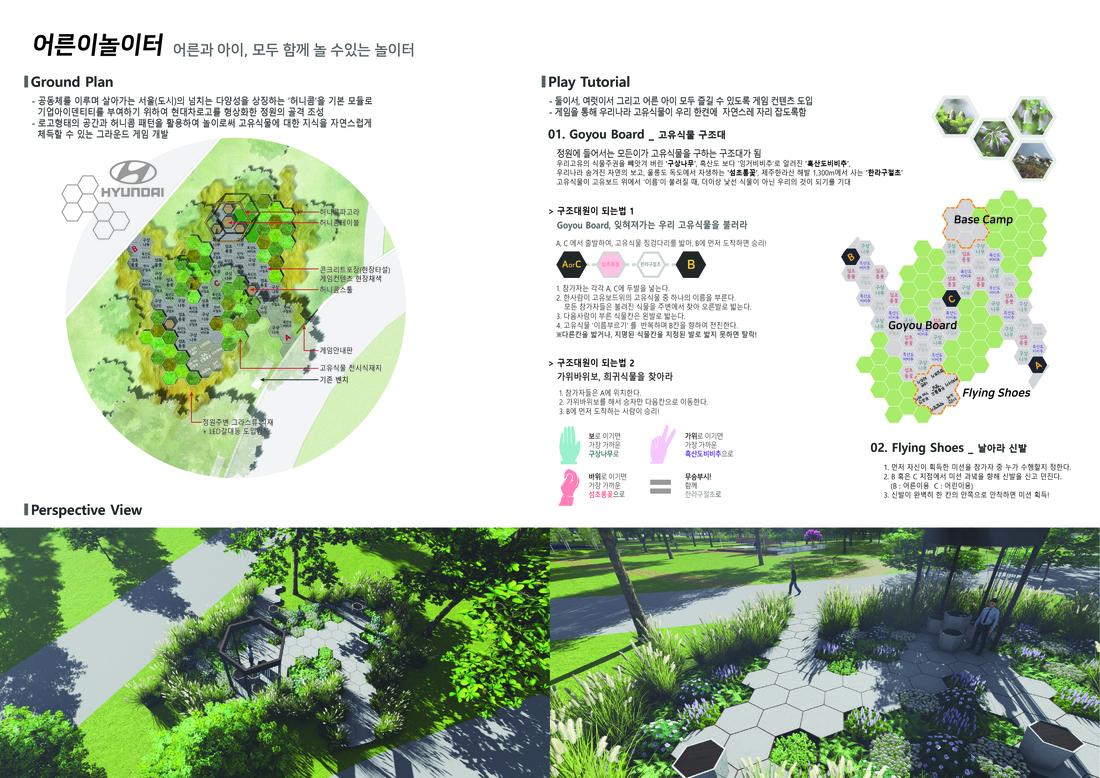 공동체를 이루며 살아가는 서울(도시)의 넘치는 다양성을 상징하는 '허니콤'을 기본 모듈로 기업아이덴티티를 부여하기 위하여 현대차 로고를 형상화한 정원의 골격을 조성했다. 로고형태의 공간과 허니콤 패턴을 활용하여 놀이로써 고유식물에 대한 지식을 자연스럽게 체득할 수 있는 그라운드 게임을 적용했다.