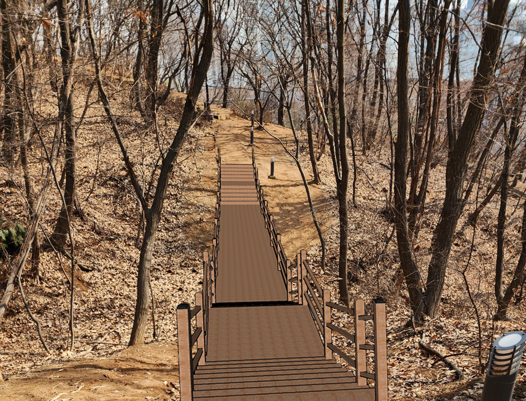 숲길과 놀이·휴게공간의 안전성을 높이고 보행 접근성을 개선하여, 일상 속에서 자연을 편하게 즐길 수 있는 생활형 공원으로 정비한다. 구릉 지형에 데크길과 계단을 설치하여 온전히 즐기는 쾌적하고 감성적인 숲길 경험을 제공한다.