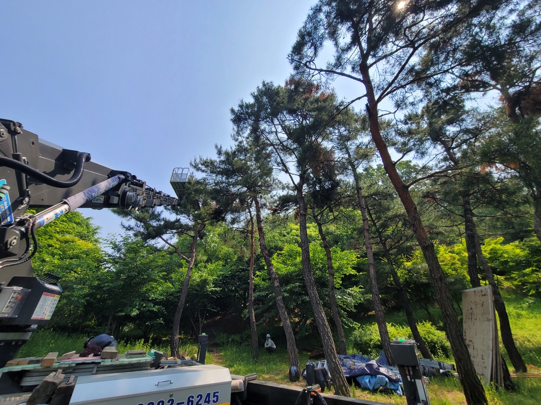 소나무 가지를 잘라주어 통풍을 원활하게 하고, 수형을 잡아주는 작업입니다.